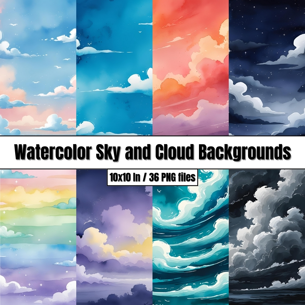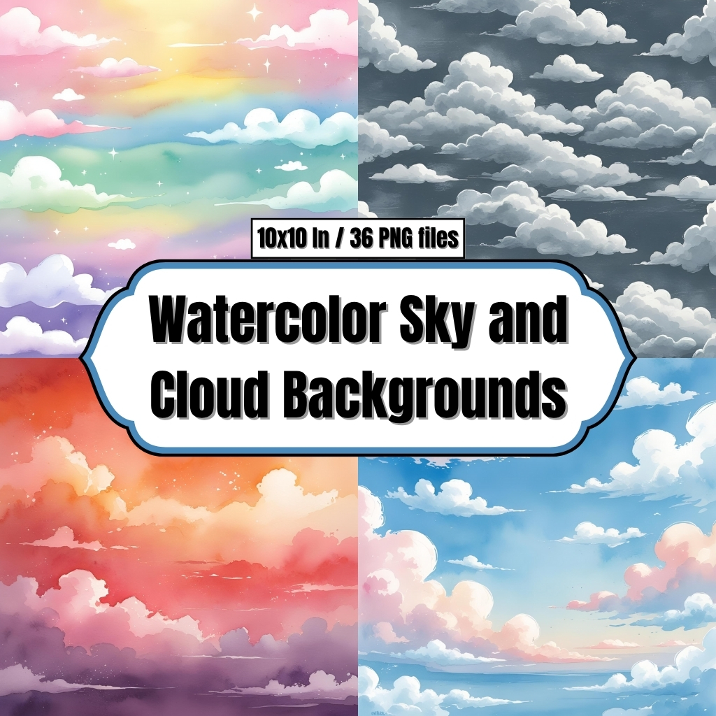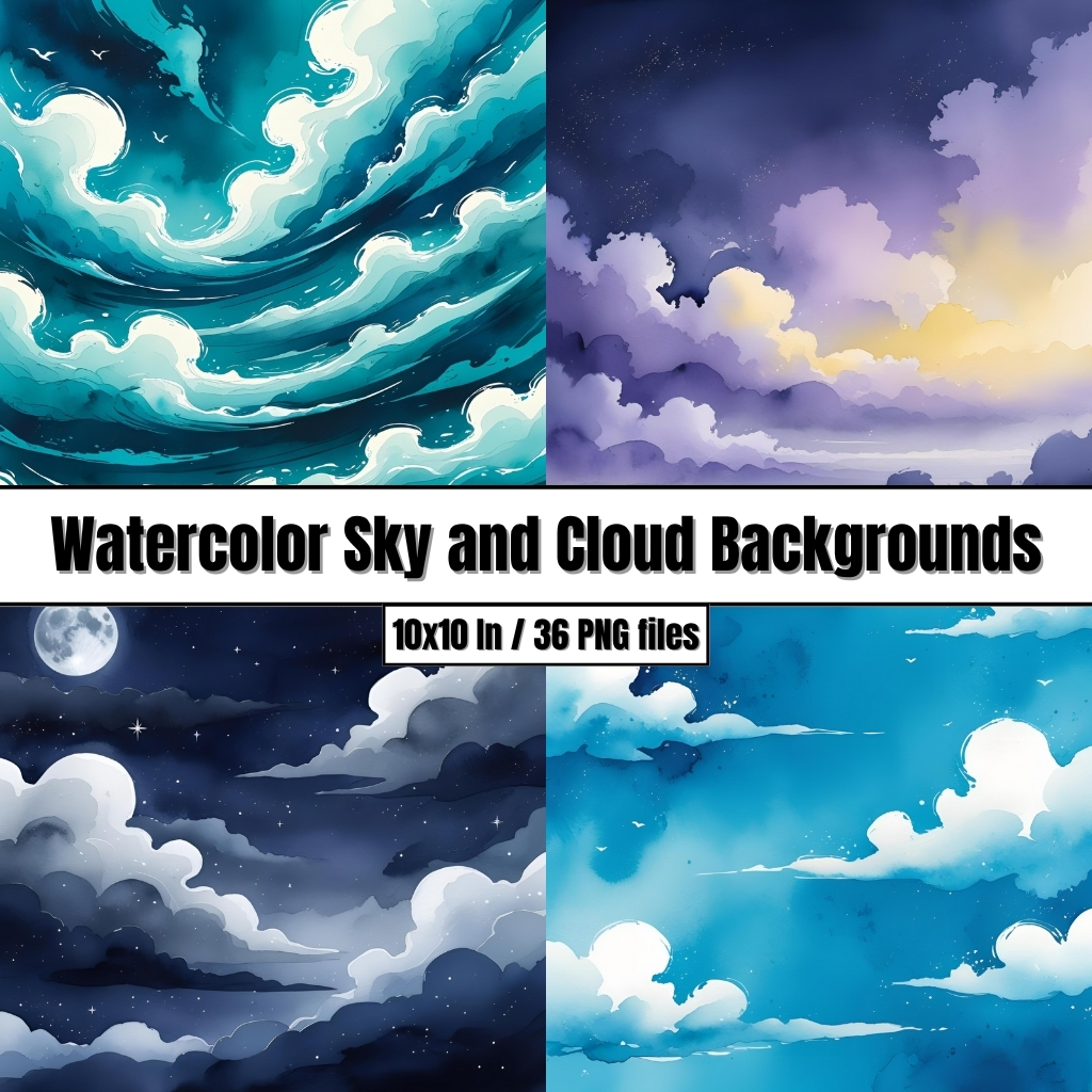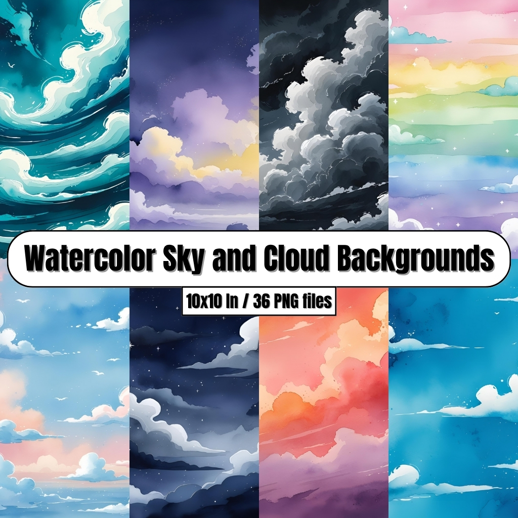 Watercolor skies evoke a sense of peace, imagination, and wonder. They are perfect for use in educational and creative settings where a soft, inspiring touch is needed. Each background was hand-painted with care and scanned in high resolution, making it easy to add artistic quality to any digital or print project.